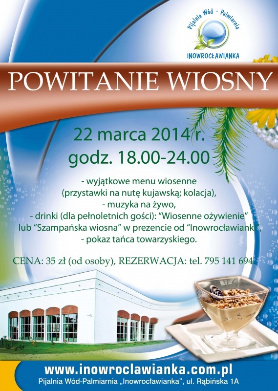 Pogoda iście... jesienna, a my - na przekór aurze - zapraszamy Państwa na "POWITANIE WIOSNY" (22 marca). Jesteśmy pewni, że wspólnie "wyczarujemy" wspaniałe słońce... Atmosfera z pewnością będzie gorąca ;))) Atrakcja wieczoru - pokaz tańca towarzyskiego (wystąpią: Nikola Bubacz i Kacper Ślefarski). Rezerwacje już przyjmujemy. Zapraszamy:)))